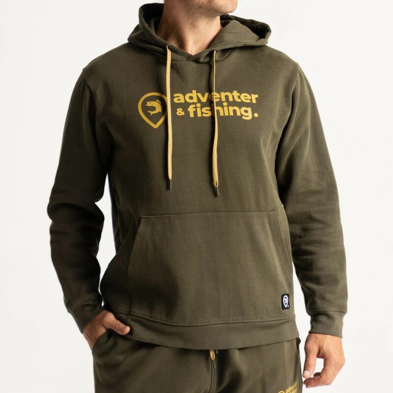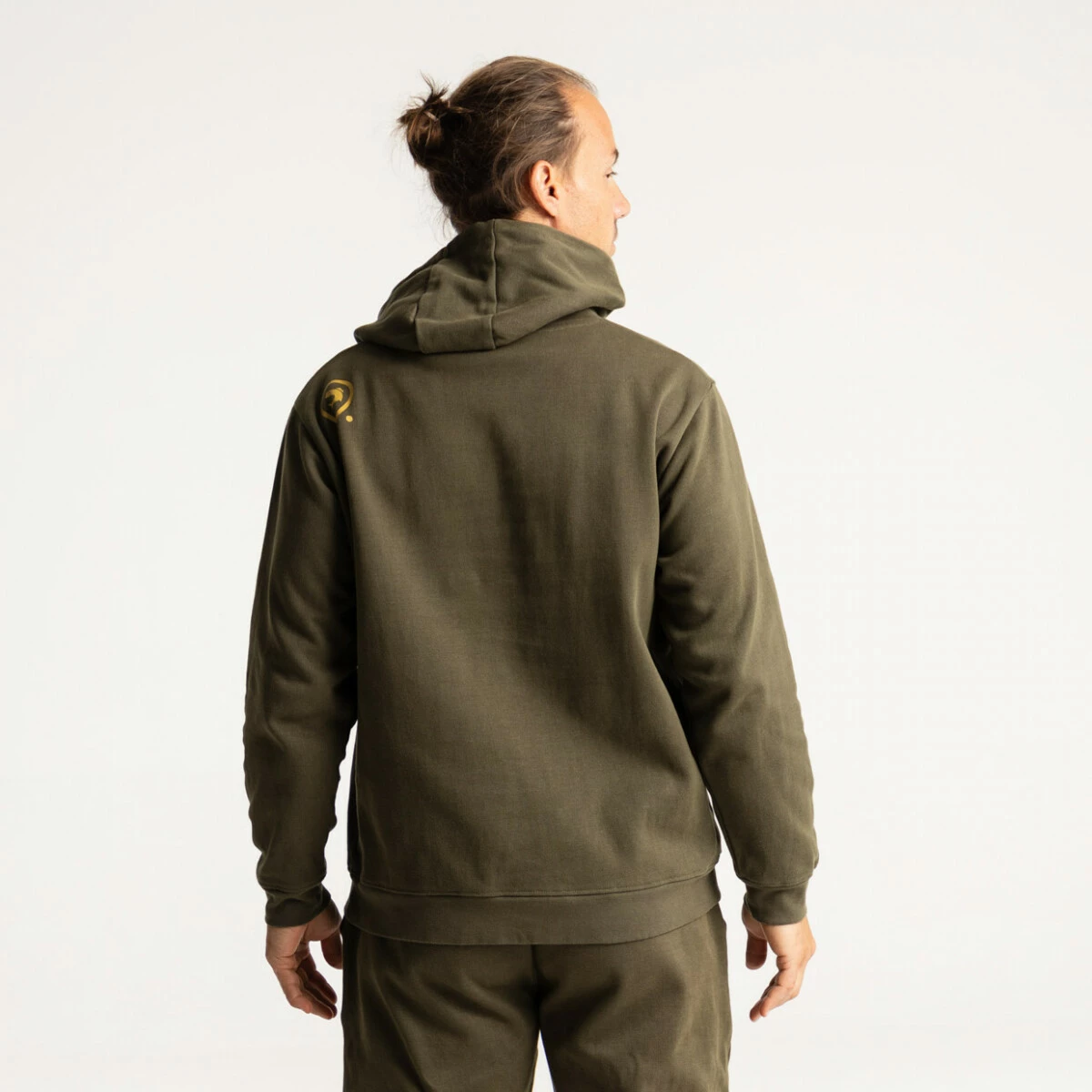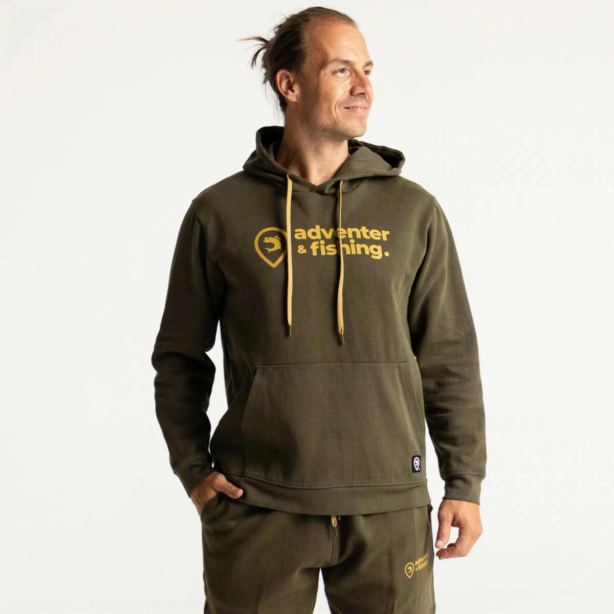 Pánská tepláková mikina s kapucí v khaki barvě s nápisem v pískově hnědé barvě Sand. Díky měkkému materiálu z 85% bavlny a pohodlnému střihu je ideálním společníkem k vodě, při cestování nebo při jiných volnočasových aktivitách. Vpředu je vybavená velkou klokaní kapsou. Pro ještě větší pohodlí si k ní nezapomeňte obléct také bavlněné teplákové kalhoty ve stejném designu.