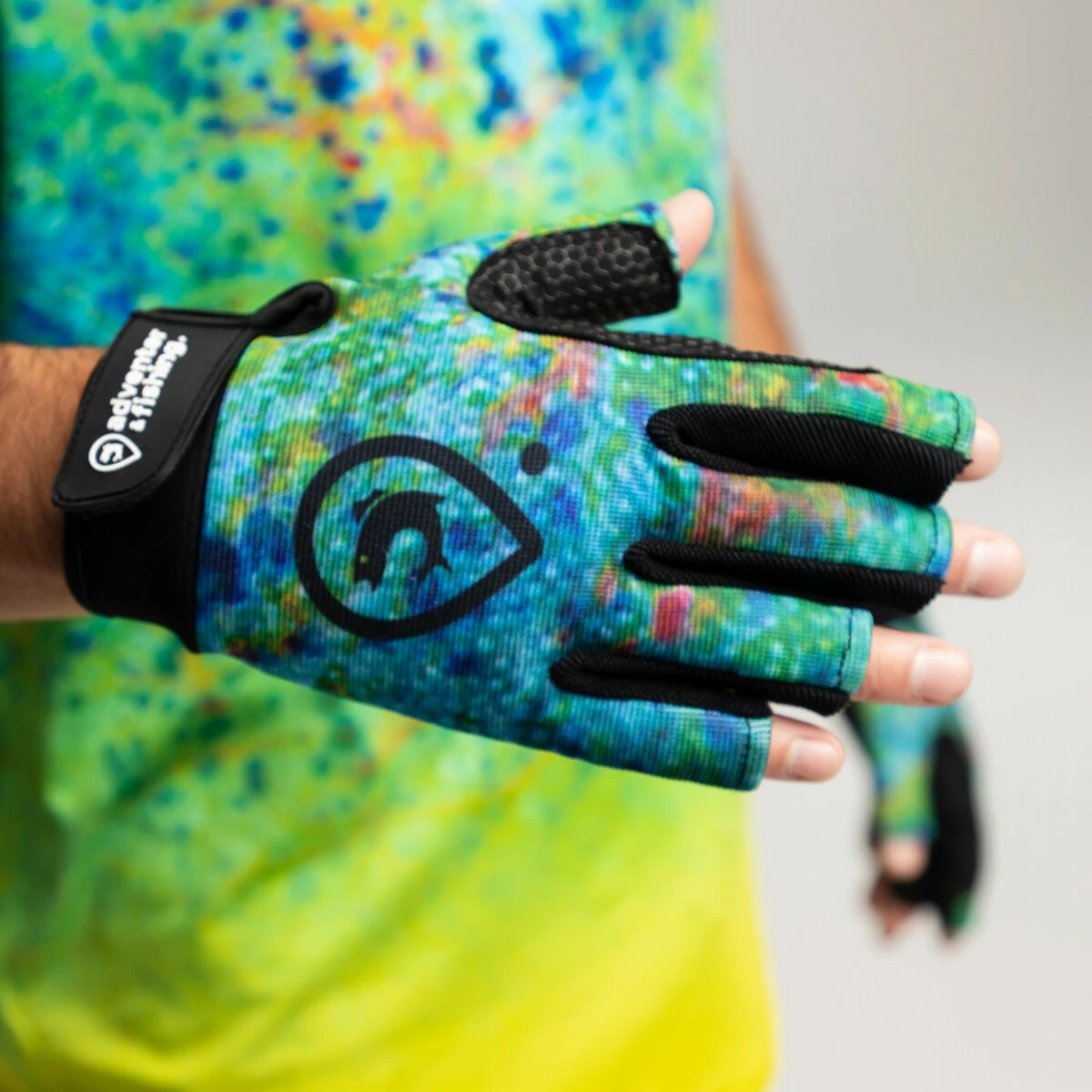 Pánské rybářské rukavice s motivem Mahi Mahi (Zlak nachový). Nezbytný doplněk každého rybáře, zejména při lovu na moři. Rukavice jsou z pružného materiálu s ochrannou vrstvou proti slané vodě a protiskluzovým vyztužením na dlaních. Praktické zapínání na suchý zip na hřbetech rukou vám ulehčí jejich nasazení. Tato varianta rukavic má otevřené konečky prstů pro jejich maximální manévrovatelnost.