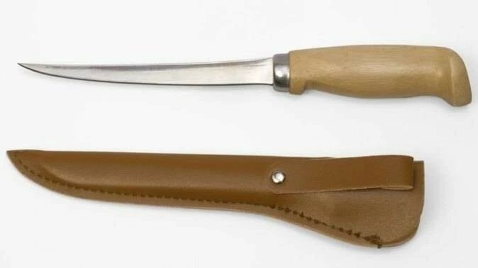 Filetovací nůž z kvalitní nerez oceli a dřevěnou rukojetí, včetně koženého ochranného pouzdra