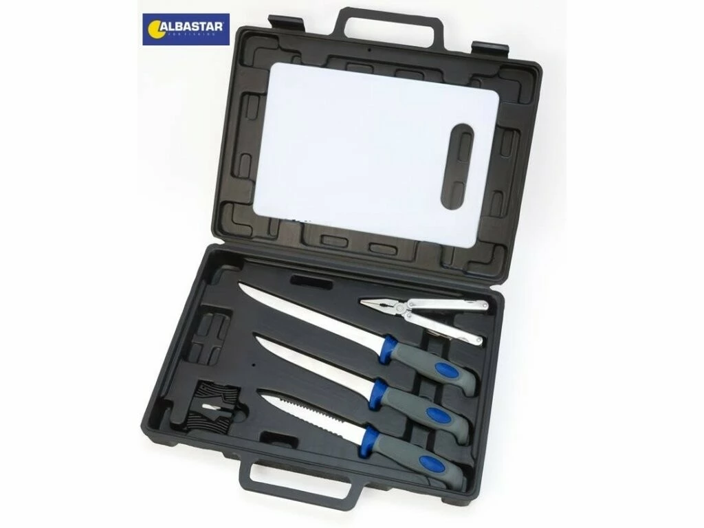 Filetovací sada obsahuje 3 kvalitní filetovací nože z nerezové oceli a střenkami z ABS materiálu, luxusní brousek, multifunkční kleště a plastové prkénko v praktickém plastovém kufříku.