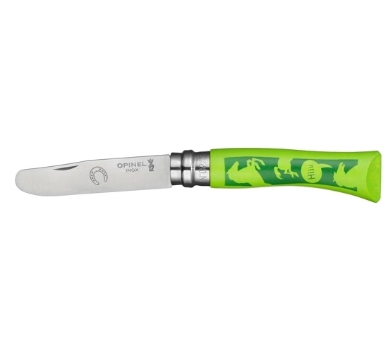 Tradiční zavírací nůž Opinel s rukojetí ze zeleně lakovaného habrového dřeva s motivem koně a čepelí z nerezové oceli se zaoblenou špičkou.