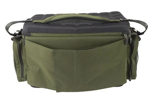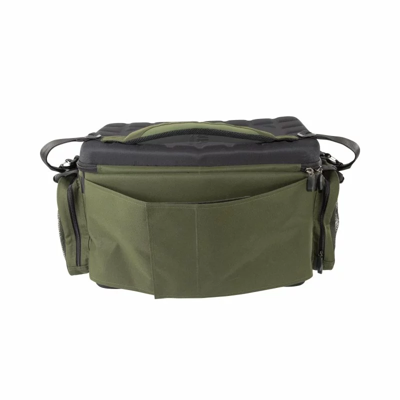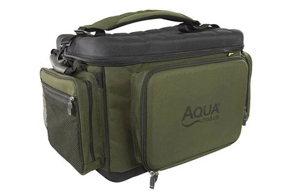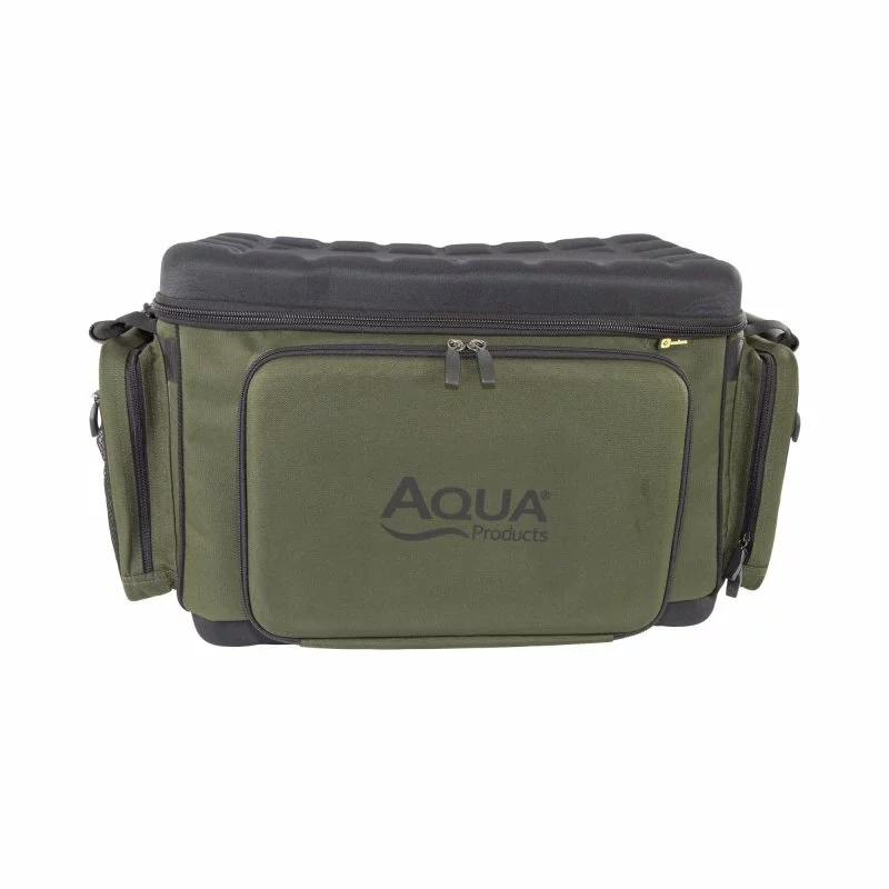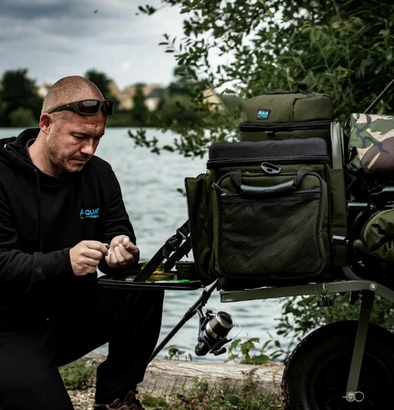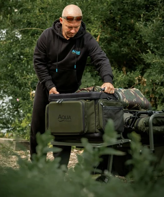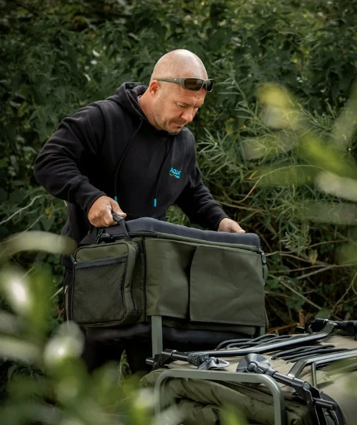 Taška na transportní vozíky od společnosti Aqua – Front Barrow Bag Black Series. Byla navržena tak, aby pasovala na většinu vozíků na trhu. Na zadní straně je vybavena úchytem, kterým ji připevníte na přední stranu vašeho vozíku a jednoduše zajistíte. Její velkou výhodou je přední vyztužená kapsa, která může posloužit také jako stoleček, když je taška stále připevněna k vozíku. Kapsa je dále vybavena popruhy, které slouží jako podpora při odložení těžších předmětů. Taška je vybavena vyztuženým víkem, díky kterému jsou všechny věci uložené uvnitř skvěle chráněny. Uvnitř naleznete velkou síťovou kapsou, která umožňuje uložení dalších věcí. Taška je velmi prostorná a umožňuje tak uložení mnoha věcí, které byste mohli na dlouhé výpravě potřebovat. V každém rohu jsou navíc výztuhy, díky kterým taška drží svůj tvar, i když je úplně prázdná. Po stranách tašky na vnější straně se nachází dvě velké kapsy, které jsou skvělé pro uložení věcí, které potřebujete mít hned po ruce. Pro jednoduchou manipulaci je taška vybavena dvěma rukojeťmi. Díky odnímatelnému vypolstrovanému ramennímu popruhu je navíc jednoduše přenosná a navíc za pomoci perfektního vyztužení EVA pěnou a vypolstrování skvěle ochrání všechno vaše drahé vybavení. Při výrobě byl použit prvotřídní materiál 900D Endura.