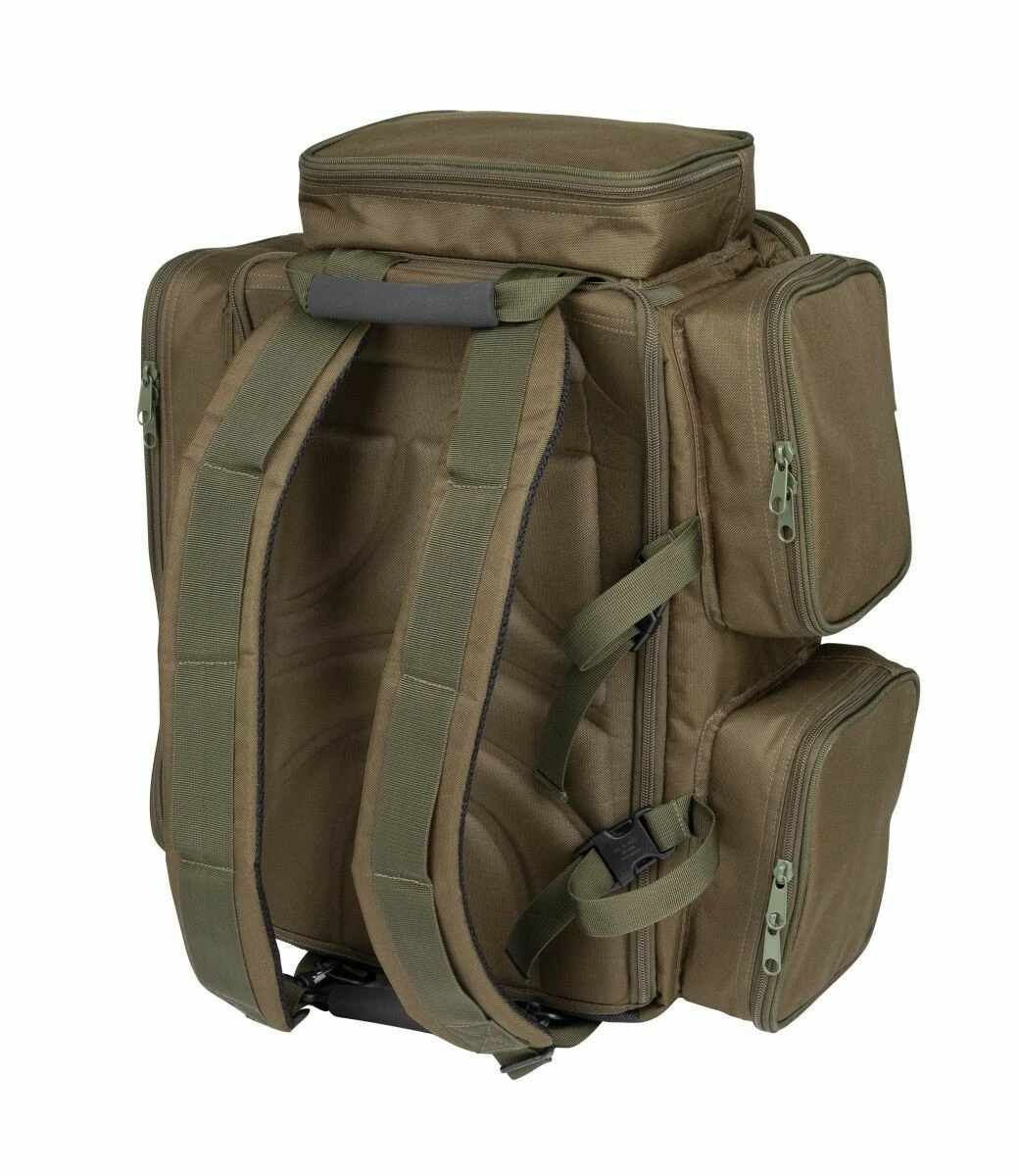 Priestranné hlavné vrecko je navrhnuté tak, aby bolo perfektne kompatibilné so všetkými taškami alebo puzdrami rady Defender Accessory. Vnútri hlavného vrecka sa nachádza vrecko so sieťkou napríklad na uloženie rybárskych dokladov, ale ponúka väčší priestor než len na rybárske doklady. Predná strana je vyrobená z tvrdej EVA škrupiny a ponúka maximálnu ochranu pri preprave a skladovaní. Po stranách sa nachádza jedno veľké postranné vrecko a na druhej strane sa nachádzajú dve menšie postranné vrecká. Všetky tieto vrecká sú na zips. V hornej časti sa nachádza väčšie vrecko na uloženie drobností, kŕmenia alebo dózičiek na nástrahy. Na spodnej a hornej strane sa nachádzajú dve madlá pre jednoduchšiu manipuláciu. Ďalej sa na spodnej strane nachádza odolná, nepremokavá vrstva. Batoh je ďalej vybavený polstrovanými a nastaviteľnými popruhmi, ergonomickým a polstrovaným chrbtom.