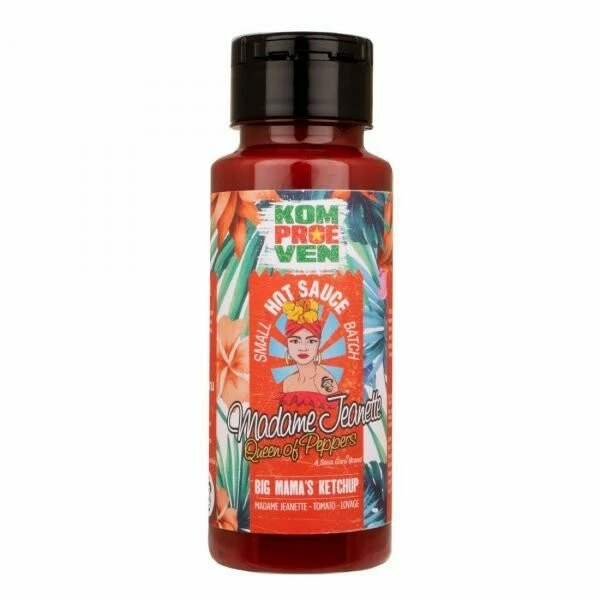 Big Mama’s Ketchup 250ml – vyrobeno na základě tajného receptu. Tradičně vyrobené z rajčat, pečených paprik a lávových bylin alias ‘Maggi plant’, zcela přírodní verze Maggi; skutečnou základní ingrediencí při vaření v Surinamu. Přidejte pálivost a vůni papriček Mme J. a podívejte se na toto šíleně lahodné koření