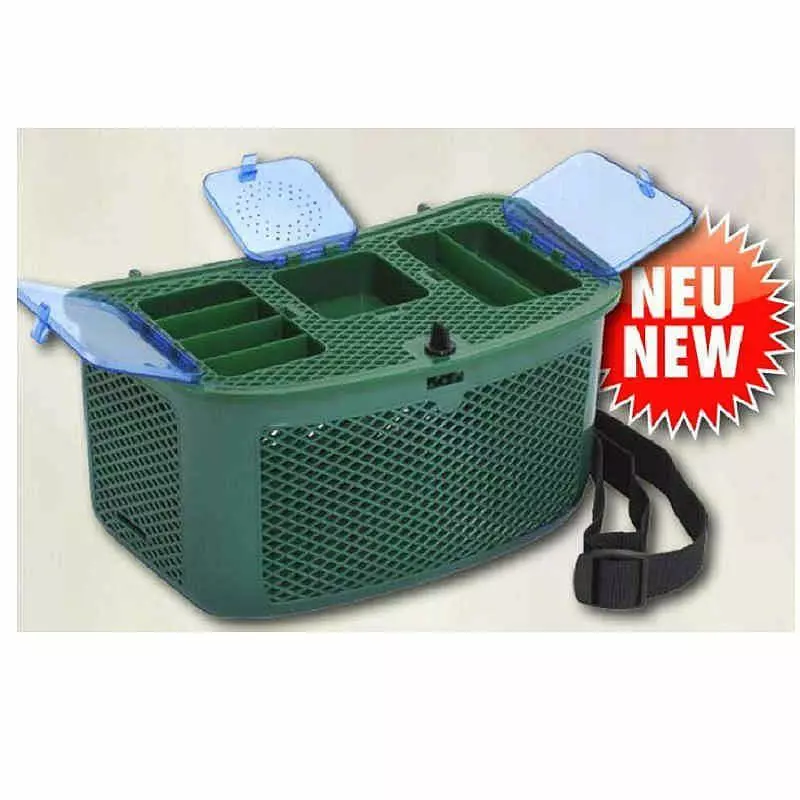 Plastový košík na úlovky, který má na víku několik přihrádek.