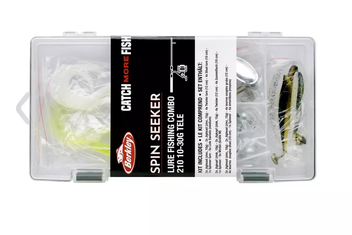 Součástí tohoto komba je krabička na náčiní, která obsahuje návnady a koncové náčiní - vše, co potřebujete k rybaření.