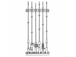 Nástěnný stojan na pruty. Umožňuje bezpečné uložení až 6 rybářských prutů ve svislé poloze. Jeho horní část má speciální polystyrénové úchyty, které chrání pruty před pádem.