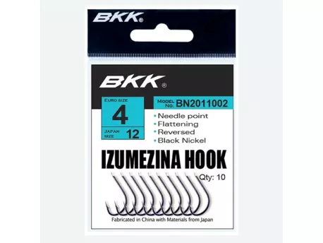 Diamantová série Izumezina háčků s lopatkou byla navržena pro chytání s všemi druhy malých nástrah jako jsou červi, kukly, ale mohou být použity i třeba na partikl. Tato série je pojmenována po BKK vysoce modulární karbonové oceli, která zajišťuje excelentní sílu, ohebnost a oděruvzdornost. Háček je potažený černým niklem, který skvěle odolává korozi ve slané vodě. Jeho matná barva neplaší ryby odlesky. Kombinace offsetového hrotu (Kirbed) a rovného háčku zajišťuje okamžitý a kvalitní zásek.
