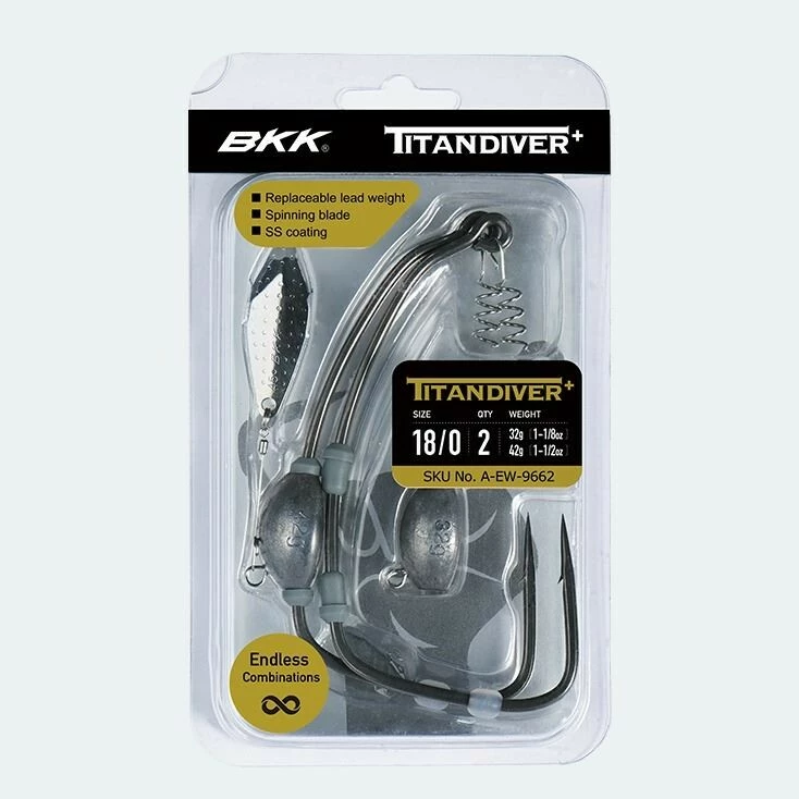 Háček BKK Titan Diver+ je nejvyšší evolucí v Titan sérii. Jedná se o naprostý průlom v tomto typu háčků. Diver+ má všechny vlastnosti Titan háčků - Super Slide potažení, hrot ostrý jako jehla, pružinku na nástrahu a silikonovou zarážku – to vše je doplněno o intuitivní systém zátěže. Tento systém umožňuje mnoho variant, jak přidat zátěž na vaši nástrahu. Olovo totiž může klouzat po ramínku háčku, což stimuluje kreativitu rybářů a jejich možnost přizpůsobit se různým technikám a podmínkám. Spodní očko na zátěži umožňuje přidat rotační plíšek. Součástí balení háčku jsou různé zátěže.