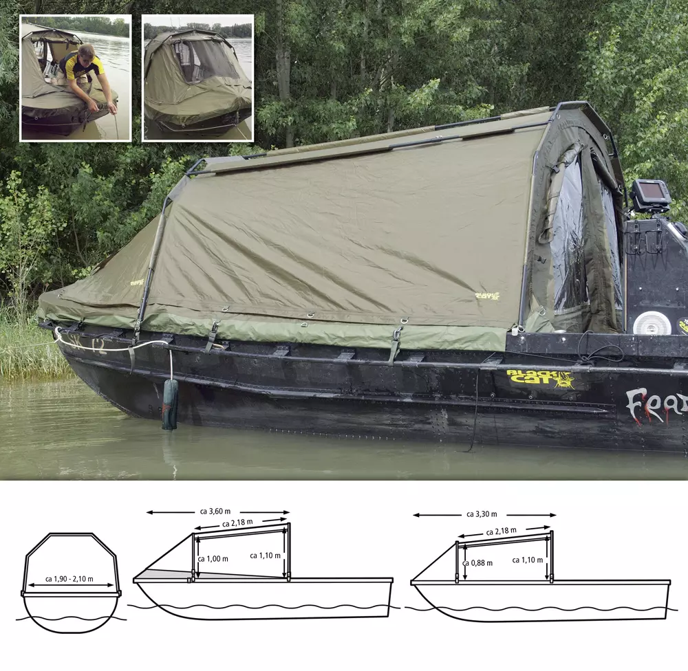 Díky jedontlivým upevňovacím bodům může být 3,6 metrů dlouhý stan postaven na jaké-koliv běžné sumcařské lodi. Díky pevnému materiálu s vodním sloupcem 5000 mm a vchodové straně sahající až na dno lodi je rybář na lodi chráněn před jakýmkoliv počasím. Velké průhledné okno Vám zajistí perfektní výhled na Vaše pruty. Dodávaná moskytiéra na zip v přední části stanu nabízí ochranu před hmyzem během letních nocí. Konstrukce složená ze 3 částí drží stan pevně jako skálu i během bouřky. Dostačující počet ukotvovacích oček poskytuje více možností upevnění. Druhá vchodová strana na přídi umožňuje dobrou manipulaci s kotvou. Přední oblouk je snížen kvůli aerodynamickému odporu při jízdě. Materiál: 100 % polyuretan 2100 PU.