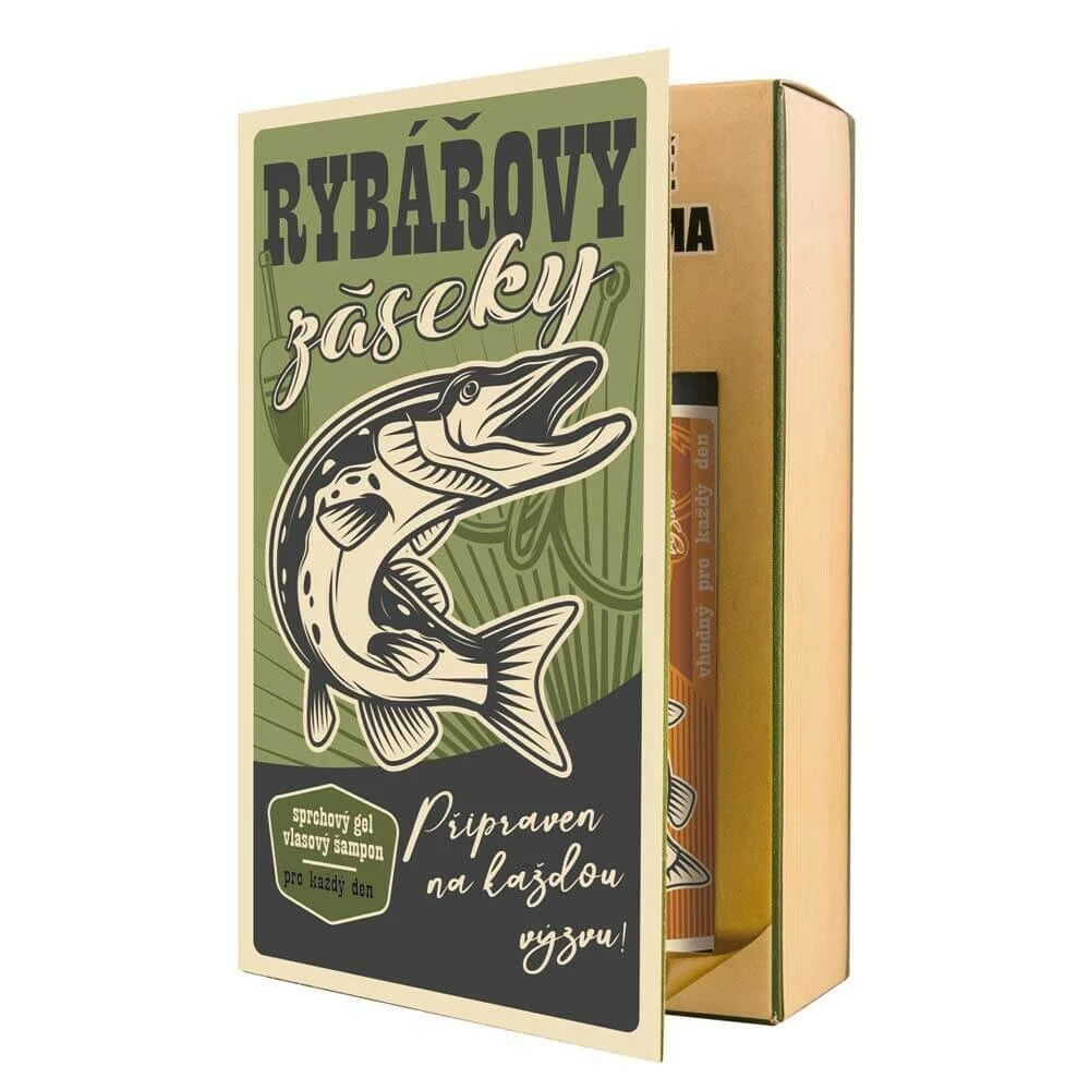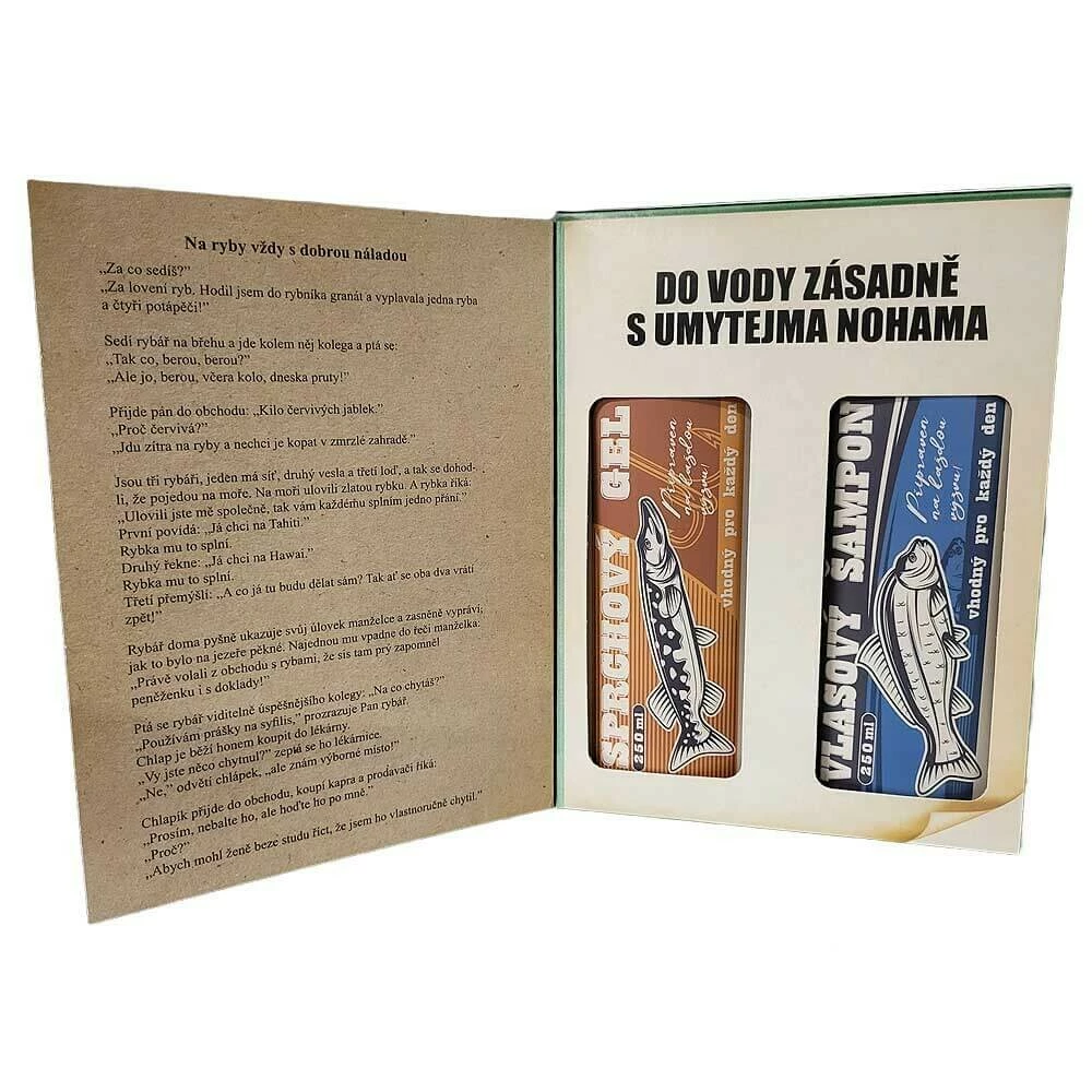 Kosmetická sada pro rybáře. Kosmetický dárkový balíček obsahuje sprchový gel a vlasový šampon s olivovým olejem. Po odklopení přední strany krabičky si můžete přečíst několik krátkých rybářských vtipů - kniha pro rybáře.