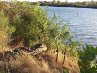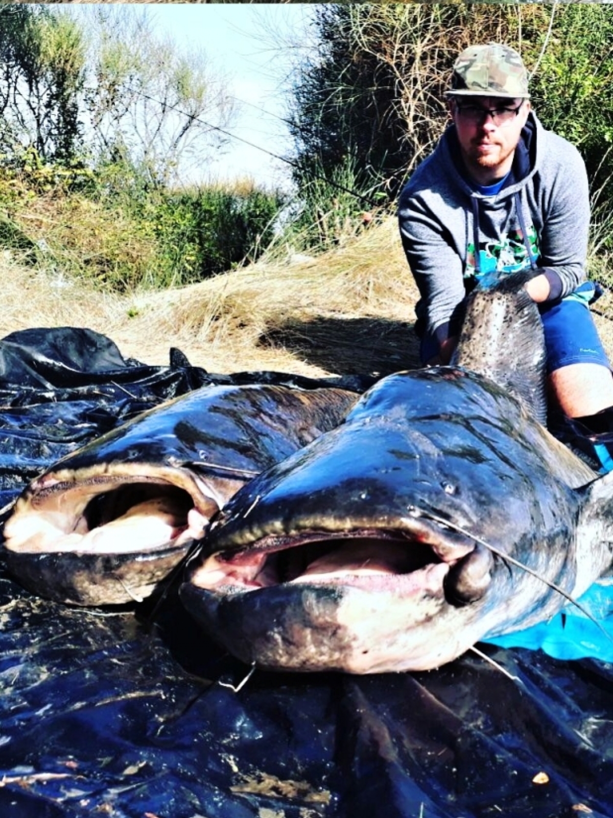 Počasí nám přálo, bylo teplo, vítr ustával a k večeru ustál úplně. Hladina byla klidná. S Petrem jsme se rozhodli, že zkusíme nástrahy nachytat vedle, o kus dál od prutů, ale než jsem se stihl pobalit, přišel první záběr. Po zdolání ukazuje metr 160cm, v tom hned přichází druhý záběr na Petrův prut, také hezká ryba, měříme 170cm.