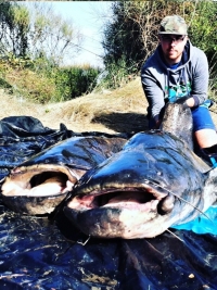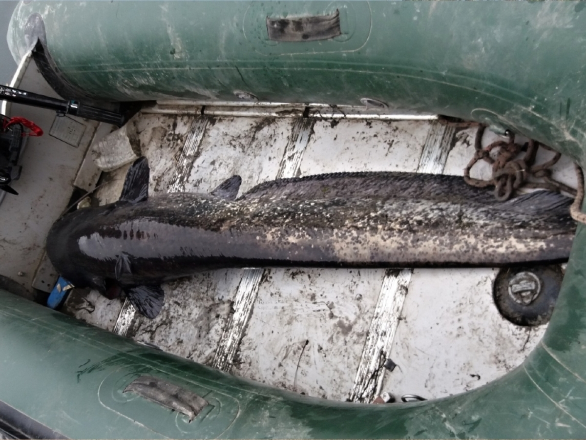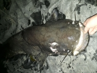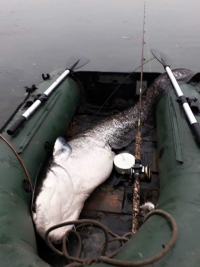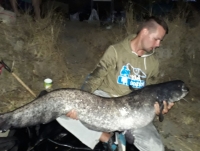 Kolem 5. hodiny ráno mi volal Petr, že měl záběr a po vytažení ryby ke břehu zjistil, že se mu do prutu zamotal můj utržený sumec s celou mojí montáží. Byl jsem rád, že se ryba vytáhla a nikde nezůstala s háky v tlamě. Sumcovi jsme naměřili 180cm. Další noc přišel pěkný záběr na prut Petrovi na koncový splávek, ale ryba vjela do druhého prutu, museli jsme na vodu vymotat prut a sumce zdolat. Po návratu kluků z vody jsem zjistil, že se sumec vytrhl z montáže a zasekl trojháky do člunu, takže velké zklamání. Odhadem ryba měřila asi 220 cm.