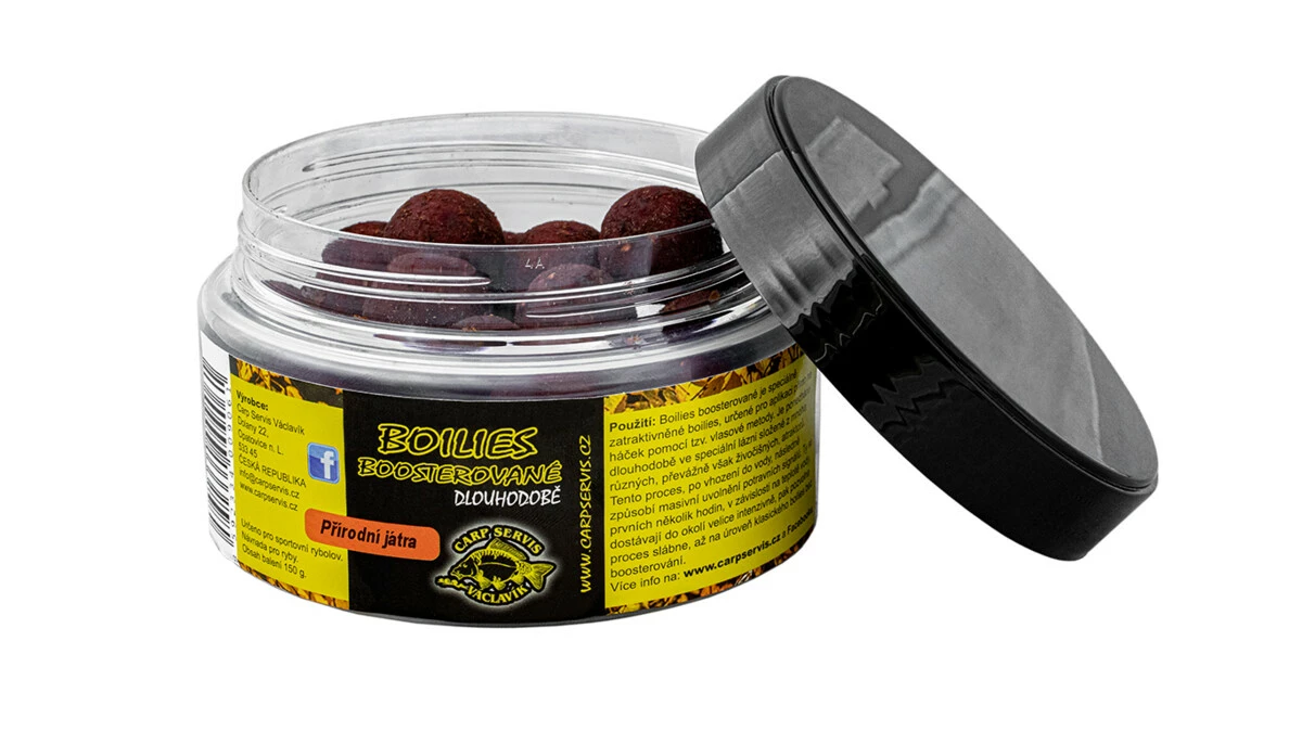 Boilies boosterované je speciálně zatraktivněné boilies určené pro aplikaci přímo na háček pomocí tzv. vlasové metody. Je ponecháno dlouhodobě ve speciální lázni složené z mnoha různých, převážně však živočišných atraktorů. Tento proces po vhození do vody následně způsobí masivní uvolnění potravních signálů. Ty se prvních několik hodin, v závislosti na teplotě vody, dostávají do okolí velice intenzivně, pak pozvolna proces slábne, až na úroveň klasického boilies bez boosterování. Na toto boilies ryby reagují prakticky hned. Kulki booster sš specjalnym produktem przeznaczonym do stosowania bezporednio na haczyk za pomocš tzw. metody włosowej. Produkt ten przed zapakowaniem pozostawiony jest przez długi czas w specjalnej kšpieli, która składa się z wielu różnych, ale głównie zwierzęcych aromatów. W kontakcie z wodš następuje proces intensywnego uwalniania sygnałów żywieniowych.W pierwszych kilku godzinach, w zależnoci od temperatury wody, proces ten przebiega niezwykle intensywnie, a następnie stopniowo się osłabia, aż do poziomu klasycznych przynęt bez wzmacniacza. Na tę kulkę proteinowš ryby reagujš niemal natychmiast. Výrobce: CSV