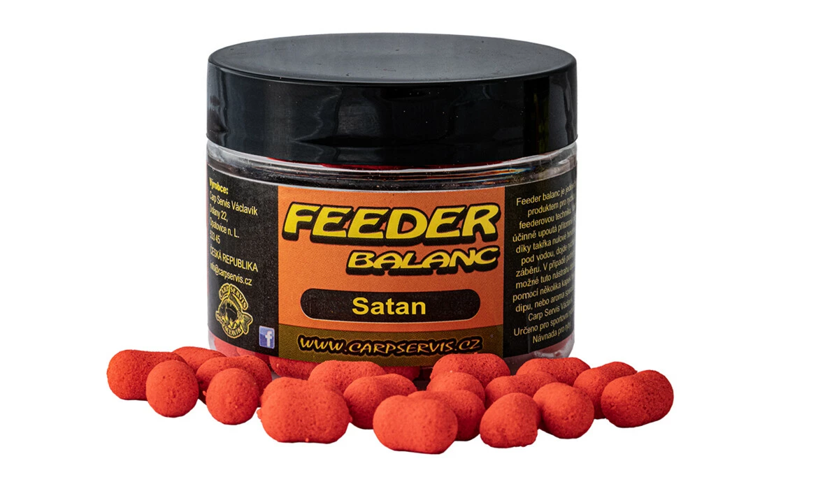Feeder balanc je nadlehčená (neutrální - vyvážená) silně aromatická nástraha ve výrazných barvách. Je určená pro feeder nebo lehkou kaprařinu. Nutno nastražit pomocí vlasové metody nebo silikonových kroužků. Feeder balanc je jedinečným produktem pro rychlou feederovou techniku. Velmi účinně upoutá přítomné ryby a díky takřka nulové hmotnosti pod vodou dojde rychle k záběru. V případě potřeby je možné tuto nástrahu dipovat pomocí několika kapek feeder dipu nebo aroma speciálu od Carp Servis Václavík. Dnes již Satan není novinkou, však zcela jistě je možné říci, že je pilířem současnosti. Pro tento komplex špičkových atraktorů jsme zvolili poněkud netradiční název. A sice SATAN. Není to náhodou. Vždyť která nástraha se může chlubit tak explozivním spektrem nutričních i atrakčních komponentů, které svou vyváženou účastí dávají tomuto boilies obrovský potenciál pro celoroční rybolov. Přestože se v Satanovi skrývá široká škála živočišných derivátů, nečekejte, že bude čistě letním speciálem. Zejména v chladném počasí závěru roku se nám Satan osvědčil jako úderná zbraň, jež se až zdá, že nebude mít pro tento čas konkurenta. Mezi takzvané standardy našich výrobků patří enzymatické suroviny a přírodní koření, které jsou bez pochyby stavebním pilířem ve většině našich boilies. Svou osobitost Satan získal z kombinace několika, pro tento typ boilies, vrcholných atraktorů. Jedná se zejména o mix extrémně pálivých výtažků z chilli, paprikově kořeněného základu a extraktu ze zelených bylin. Satan nejspíše nebude patřit, v nabídce CSV, mezi senzoricky nejvýraznější nástrahy, ovšem jeho přednosti docení především kapři, kterým se nesporně velmi líbí. Však posuďte sami. - Rozměr nástrahy: 8x12 mm Výrobce: CSV