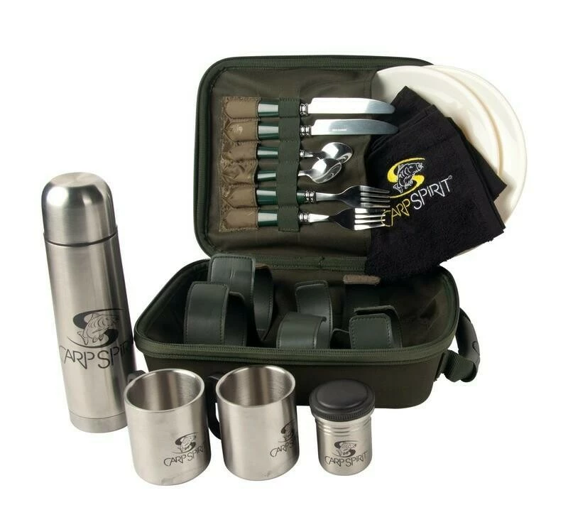 Kempovací jídelní souprava pro 1–2 osoby v praktické brašně. Obsahuje 2 talíře, 2 sady příborů, 2 hrnky, 2 pohárky, 1 termosku a dva ubrousky. Brašna má zesílené švy a zipy.