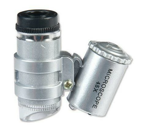 Miniaturní mikroskop s osvětlením pro kontrolu špiček háčků - okulár se zaostřováním a zvětšením 45×, s dvojicí superjasných LED pro osvětlení při kontrole háčků ve dne i v noci. Včetně baterií.