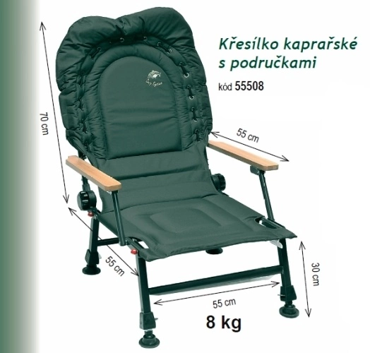 Štelovací nohy, područky a kloub na seřizování. Komfortní, kompletně polohovatelné kaprařské křeslo s opěrkami rukou pro nejkomfortnější rybolov. Velmi pevné, extra pohodlné, určené pro dlouhé výlety k vodě. Lze využít i pro přespání. Použity extra luxusní materiály.