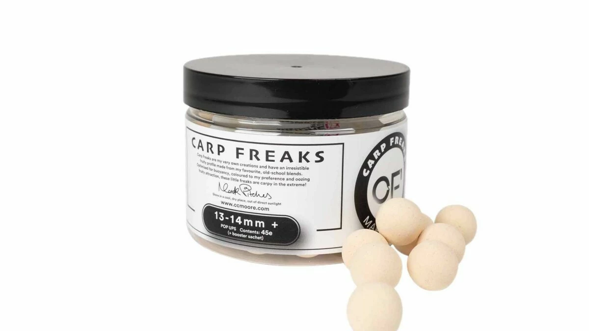 Carp Freaks jsou plovoucí boilie vyrobené dle tajného receptu známého britského kapraře Marka Pitcherse. Jejich neobvyklá ovocno-smetanová vůně je vysoce atraktivní. Zároveň mají perfektní plovoucí vlastnosti, hodí se tedy i na montáže typu Ronnie rig či Zig rig. Vyrábí se v žluté a washout růžové barvě v průměru 14 mm. V balení je i polštářek s dipem na oživení pop-up. Doporučujeme ho nepoužít hned, ale až po nějakém čase, kdy pomalu začínají pop-up vyčichávat.