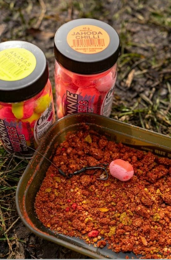 Dvoubarevné dumbellsky, které levituji těsně nad dnem jsou velkou zbraní při lovu mazaných kaprů. Mix dvou přírodních esencí a dvojité aromatizovaní zaručuje maximální efektivitu a dlouhou účinnost. Skvělé při lovu s montáží ronnie rig.