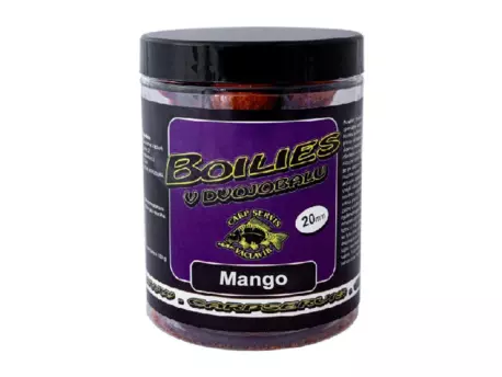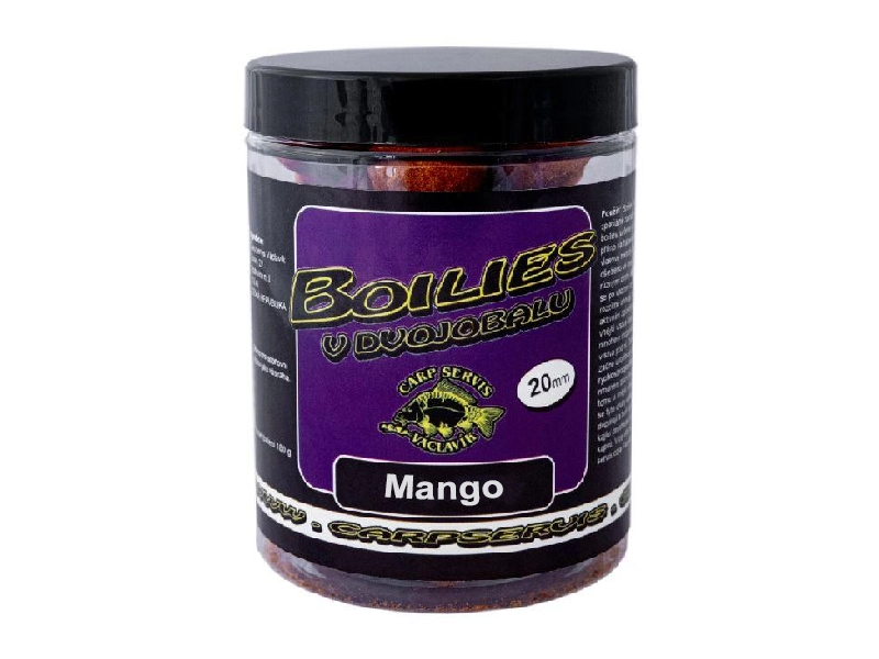 Boilies v dvojobalu je speciálně zatraktivněné boilies určené pro aplikaci přímo na háček pomocí tzv. vlasové metody. Boilies je ošetřeno ve dvou krocích různými druhy atraktorů, které se po vhození do vody rozdílně chovají. Nejprve se aktivním způsobem uvolní vnější vrstva obalu, která je mnohem rozpustnější než vrstva pod ní. Druhá vrstva se začne uvolňovat až později a rychlost rozpouštění je mnohem pozvolnější, než je tomu u vnější vrstvy. Celkově se tyto druhy atraktorů doplňují a tvoří společně vynikající prostředek k přilákání kaprů. Mango - je učiněnou explozí emocí, porušuje veškeré rybářské obvyklosti a naprosto nekonvenčně dráždí vjemy ryb, které se na tuto nástrahu vrhají, jak smyslů zbavené. Mango je kulička pro celoroční rybolov. Může vás zaskočit a dozajista se i tak stane, jak agresivně na ní budou dorážet všechny přítomné ryby. Někomu to nemusí vyhovovat, ale pro ty, kteří si chtějí zachytat a nemají na to dost času, to bude jistě skvělá volba. Toto boilies je intenzivně pikantní. Výrobce: CSV