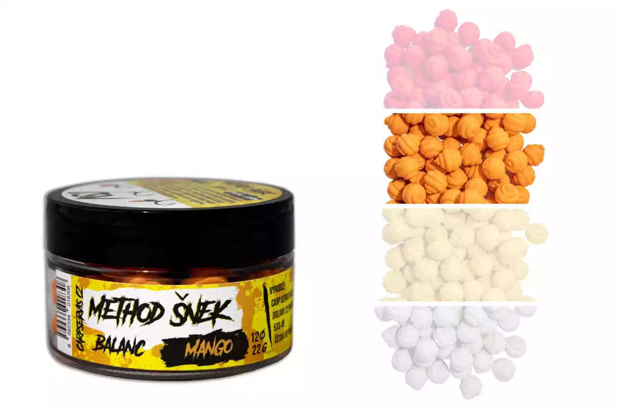 Method šnek balanc - přináší nejen klasické přednosti balanc nástrah, ale má i schopnost velmi intenzivního uvolňvování atraktorů a částečnou rozpustnost. Dalším atributem je inovativní tvar, který imituje přirozenou potravu různé druhy plžů, což je činí neodolatelnými pro většinu, i těch nejopatrnějších kaprovitých ryb. Nástrahu je možné dipovat pomocí Aroma Pop up nebo Aroma speciál od CSV. Aromatizační prostředky jsou nositelemidentických pachových silic, které jsou použity přímo v Method šnek balančních nástrahách. Vyrábí se v šesti variantách. - Příchuť: MANGO - Průměr: 12 mm - Balení : 22 g - Barva: oranžová Výrobce: CSV