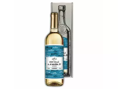 Dárkové bílé víno pro rybáře 0,75 l Chardonnay - kapr. Originální dárek pro rybáře k narozeninám, svátku nebo pro radost.