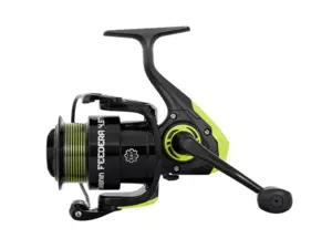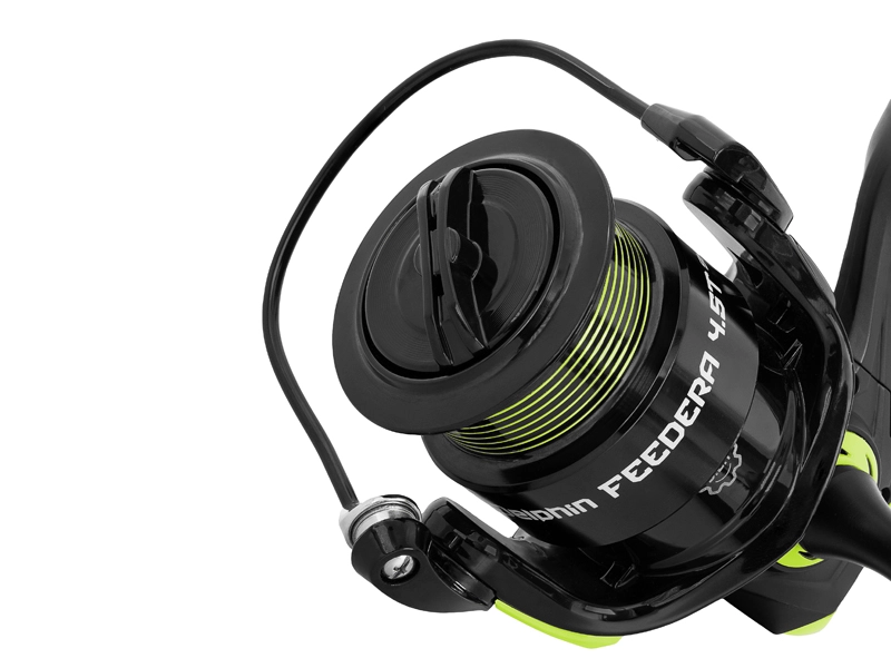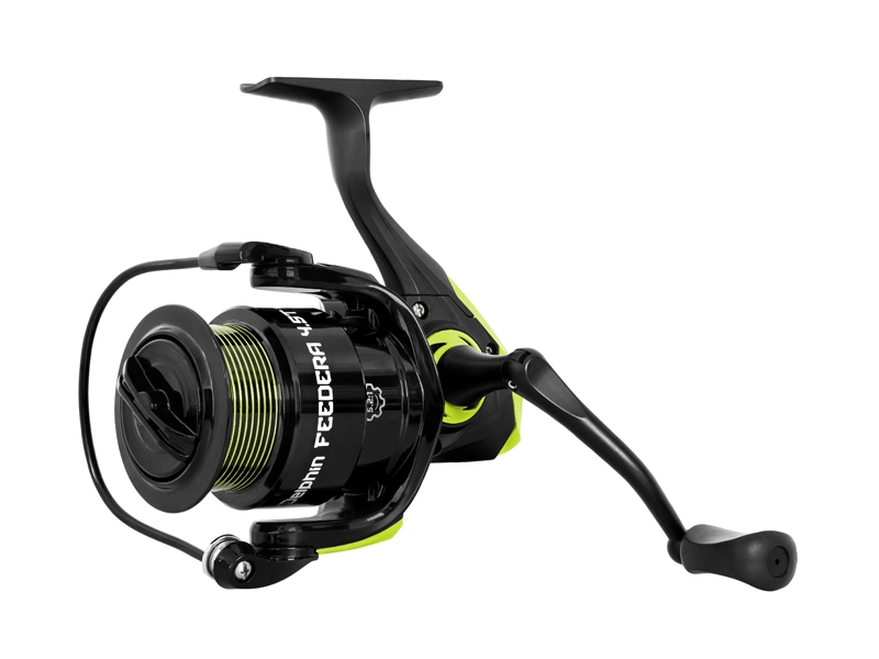 Naviják je vybaven sedmi (6+1) kuličkovými ložisky a převodovým poměrem 5,2:1, který zajišťuje dostatečně rychlé vytažení sestavy na břeh bez větší námahy. Naviják FEEDERA má také pevnou hřídel z nerezové oceli a silný kovový překlapěč s rolničkou, který zvyšuje odolnost a pevnost tohoto modelu. Sklopná klička navijáku má matně černou povrchovou úpravu a černou gumovou rukojeť, která je příjemná do ruky.
