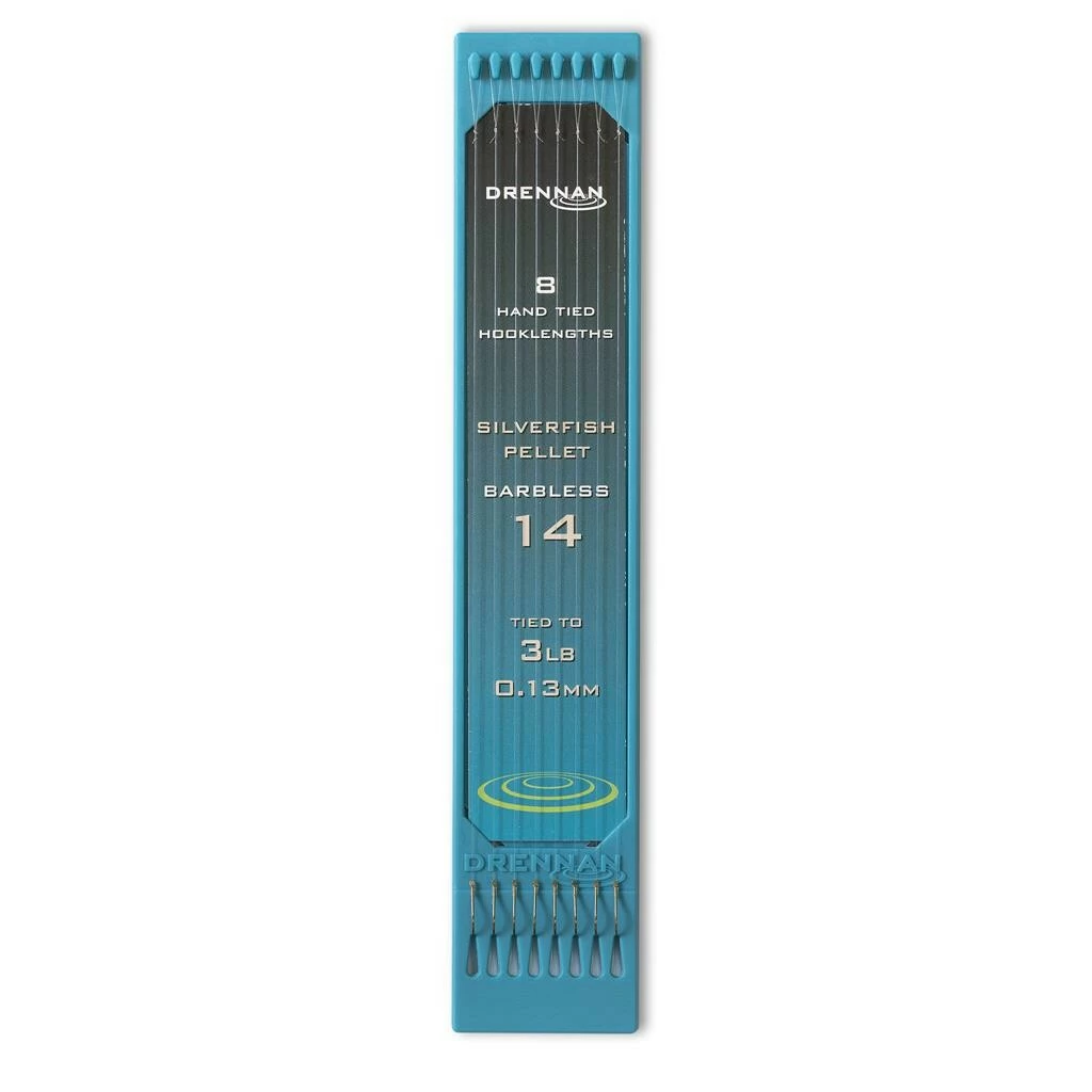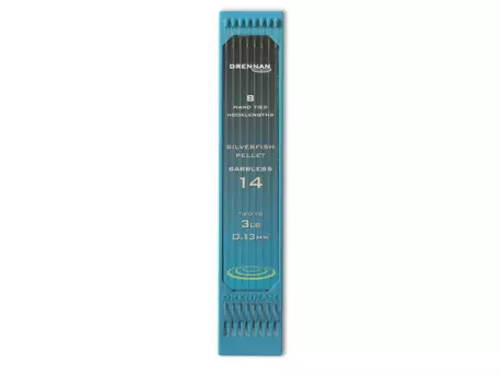Pellet Silverfish Barbless Háčky jsou speciálně navrženy pro lov pelety.Tento typ háčku má středně dlouhé raménko a chemicky ostřený dlouhý hrot. Hook Plate System:Nový koncept, destičkového uspořádání návazců délky 15 cm.8 samostatných háčků navázaných na nylonu. Tento systém pro ukládání na zpevněných destičkách udržuje návazce rovné, bez zalomení nebo poškození monofilu. • S tímto tuhým systémem pro ukládání návazců je vše udržováno v řadě, rovně a pod velmi malým napětím monofilu.• Každý jednotlivý návazec sundaný z destičky je okamžitě připraven perfektně prezentovat vaší nástrahu.• Smyčka na každém návazci je perfektně tvarovaná a háčky precizně ručně vázány.• Celková délka návazce je přesná. • Háčkové body jsou tvarované a chráně designem destičky, unikátní systém destiček zajišťuje přesnost délky návazců, která umožňuje snadný přenos návazců do krabičky Hook Box.• K dispozici je krabička Hook Box, která pojme až 30 kompetních destiček, tudíž 240 hotových návazců. Varianty: Háček č.14- 0,13mm- 1,36kg- délka 15cm Háček č.16- 0,13mm- 1,36kg- délka 15cm Háček č.18- 0,12mm- 1,13kg- délka 15cm Háček č.20- 0,10mm- 0,91kg- délka 15cm