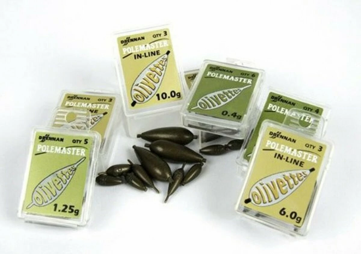 Klasické průběžné torpily ve tvaru olivky určené k dovážování splávků. V matně bronzové úpravě.