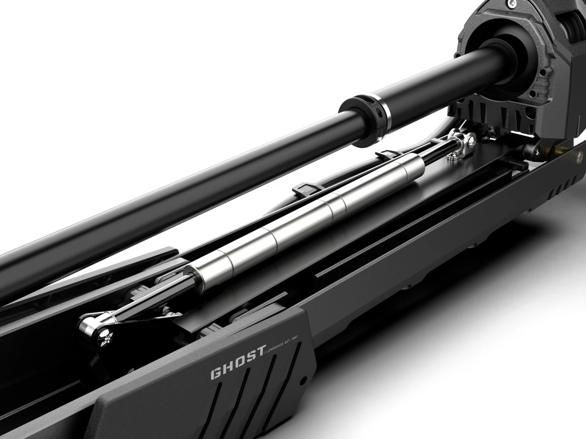 Elektromotor Ghost má dvojčinnou plynovou pístovou pružinu, která umožňuje velice tiché spuštění motoru. Právě tato pístová pružina hlavu motoru při spuštění zbrzdí tak, že ani dopad hlavy motoru na vodní hladinu není prakticky slyšet. Ani při vytahování není nutné s motorem dále manipulovat – ten se totiž při vytažení automaticky nastaví díky integrovanému stabilizátoru do ideální polohy pro usazení ve svém držáku.