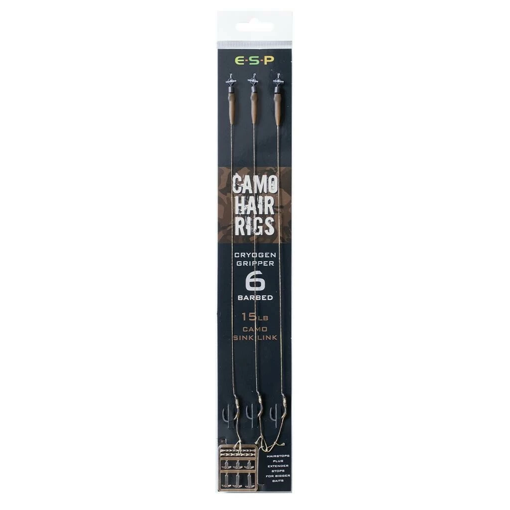 Odborně navázáno s vysokými nároky na kvalitu a detail. Návazce vytvořeny za pomocí šňůrky ESP Camo Sink Link a ultra ostrých a odolných háčků Cryogen Gripper. Integrovaný převlek Streamliner Rig Sleeve přetažený přes obratlík velikosti 9 pomáhá předcházet zamotání náhozů. Optimální délka vlasů ve vztahu k velikosti háčku, Hair Stops a Extender Stops (zarážky) jsou součástí balení. Prodlužovací zarážky jsou velmi užitečné, pokud je vyžadována větší návnada nebo pro návnady typu tzv. na panáčka. Jedná se o variantu barbed čili s háčky s protihrotem. Vlastnosti: Dostupné ve velikostech 4, 6 a 8 Dostupné v provedení Barbed a Barbless 3 návazce v balení