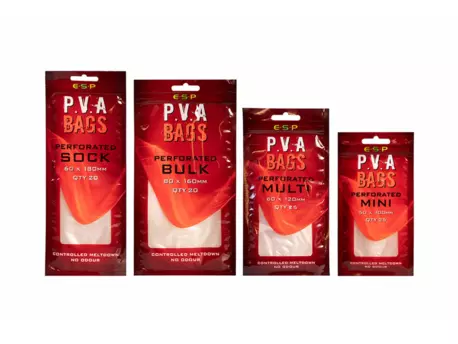 PVA sáčky značky ESP jsou k dispozici v široké škále velikostí a v hladkém (Plain) i perforovaném (Perforated) provedení. Jsou vyrobeny ze silného a pevného materiálu, který se rozpouští beze zbytků a v ideální době (mnoho tenkých sáčků se rozpadne příliš brzy a uvolní návnadu ještě před dopadem na dno). Mini – 50mm x 100mm (25 ks)Multi – 60mm x 120mm (25 ks)Sock – 60mm x 180mm (20 ks)Bulk – 80mm x 160mm (20 ks)