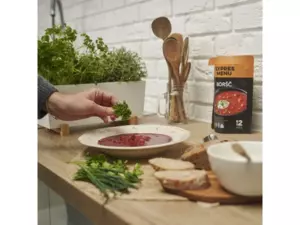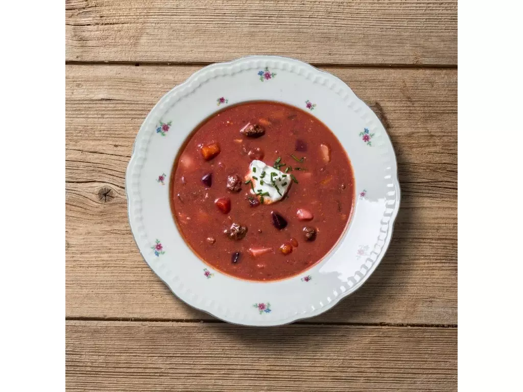 Hutná svačinová polévka z červené řepy s kousky hovězího a vepřového masa dušeného na kořenové zelenině s bramborem a hlávkovým zelím, zjemněná smetanou. Další info