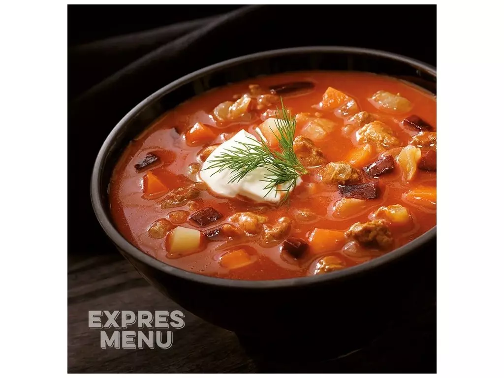 hovězí vývar (voda, hovězí maso a kosti), hovězí maso přední, rajčatový protlak (voda, rajčatový protlak, sůl), zelí hlávkové, červená řepa sterilovaná (červená řepa, voda, ocet, cukr, sůl, aroma), vepřové maso (plec), smetana, rýžová mouka, kukuřičná mouka, kořenová zelenina (mrkev, celer, pastinák, petržel), brambory, cukr, cibule, uzená slanina (vepřové sádlo), citron, sůl kamenná, paprika mletá, bobkový list.