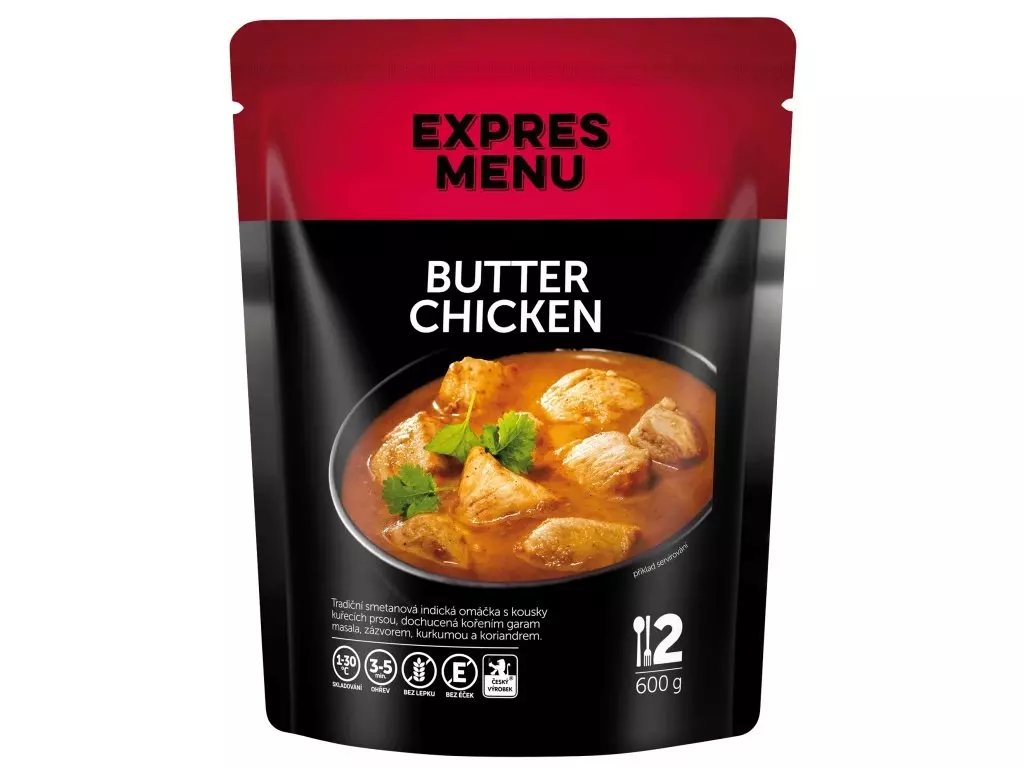 kuřecí prsa (33 %), rajčata krájená [rajčata (60 %), rajčatová šťáva, jedlá sůl, regulátor kyselosti: kyselina citronová], smetana, máslo (7,2 %), cibule, koření garam masala, limetková šťáva, česnek, sůl kamenná, koriandr, zázvor mletý, kurkuma, skořice mletá, římský kmín.