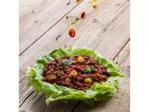 Bezmasý, lehce pikantní mexický pokrm s nahrubo nakrájeným přírodním tempehem na rajčatovém základu s červenými fazolemi, kukuřicí a červenou paprikou.