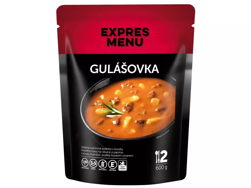 Vydatná svačinová polévka s kousky hovězího masa a brambor. Maso je orestované na cibulce a paprice, zalité hovězím vývarem. Polévka je dochucená majoránkou a česnekem. Další info