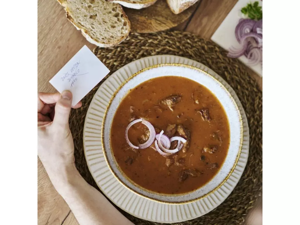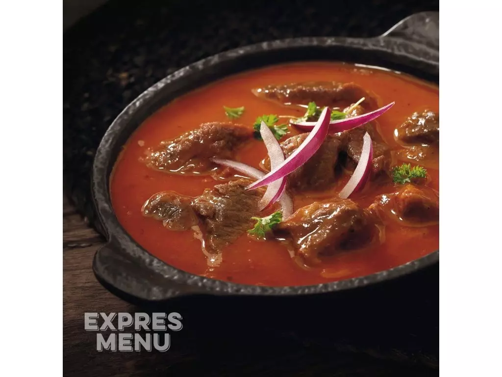 Libové kousky hovězího masa dušené doměkka v omáčce na cibulovém základu se sladkou paprikou, podlité taženým vývarem, dochucené česnekem a majoránkou. Další info