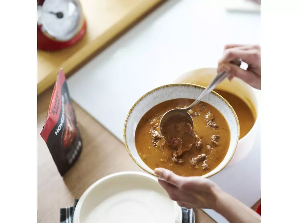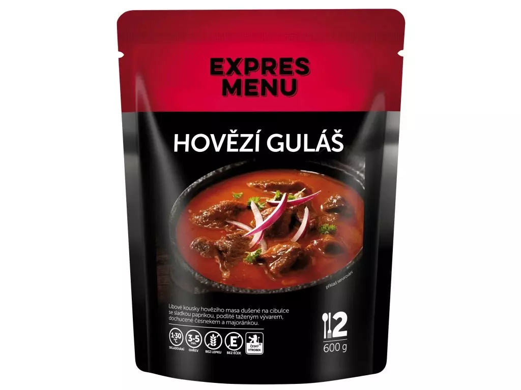 hovězí maso přední (31 %), hovězí vývar (voda, hovězí maso a kosti), cibule, rýžová mouka, česnek, kukuřičná mouka, řepkový olej, rajčatový protlak (voda, rajčatový protlak, sůl), paprika mletá, sůl kamenná, majoránka, kmín, pepř.