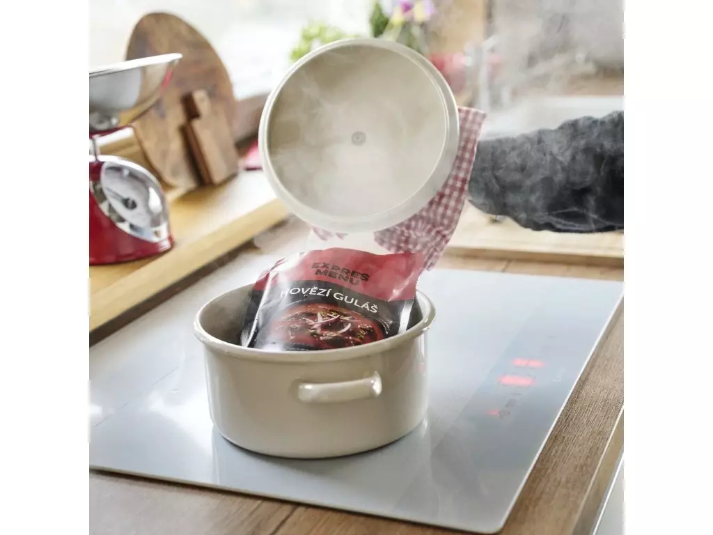 Stačí ohřát v hrnci, mikrovlnce či rychlovarné konvici a během 5 minut máte chutné jídlo na stole. Produkty jsou již zcela uvařené a tepelně zpracované. Nemusíte přidávat žádnou vodu ani jídlo převářet. S chutí do toho, hned je hotovo. Ať už jste doma, v práci či na cestách.