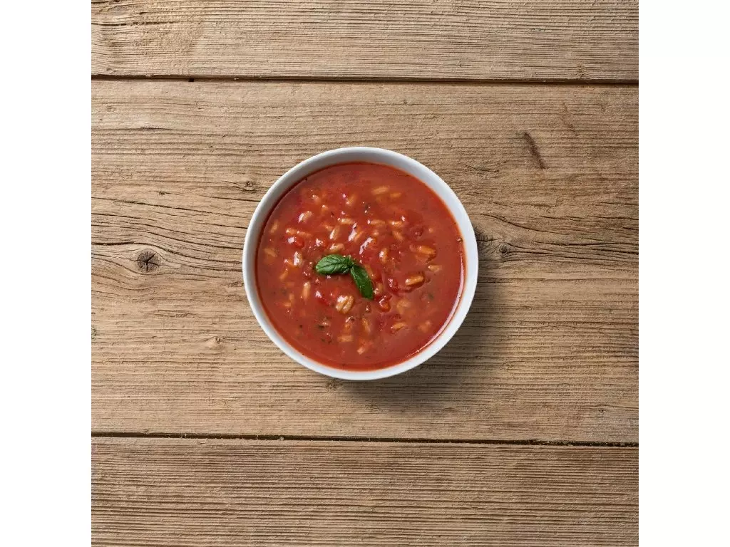 Svěží středomořská rajčatová polévka s rýží, olivovým olejem a bazalkou. NÁŠ TIP! Tuto oblíbenou polévku můžete na talíři dozdobit lžící zakysané smetany. Tato polévka je oblíbená u dětí a vegetariánů. Další info