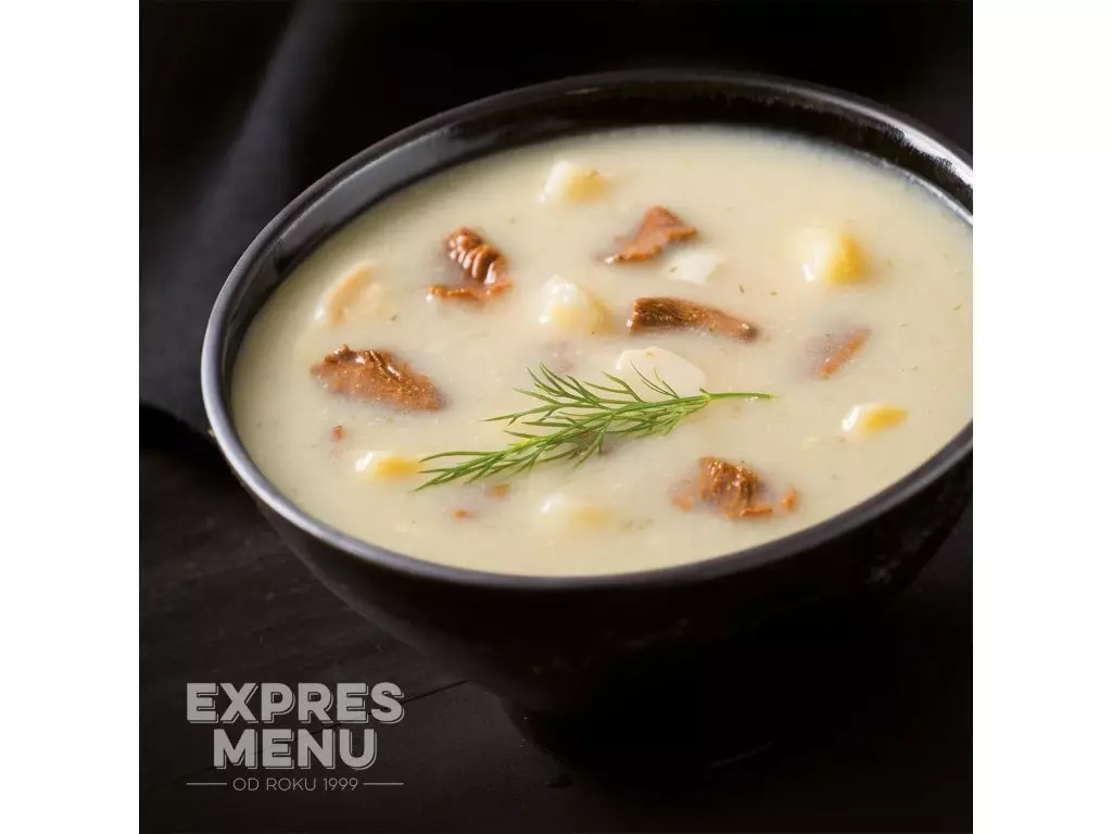 voda, brambory, smetana, vejce, houby lišky obecné (3 %), cukr, ocet, rýžová mouka, kukuřičná mouka, kopr sterilovaný (voda, kopr, ocet kvasný, cukr, sůl), sůl kamenná, pepř.