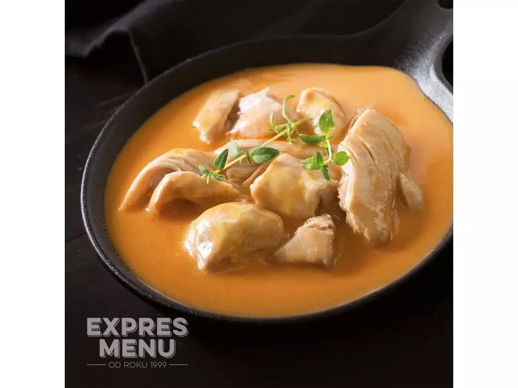 Šťavnaté kousky masa z kuřecích stehen, dušené doměkka v omáčce na cibulovém základu se sladkou paprikou. Omáčka je zjemněná smetanou. Další info