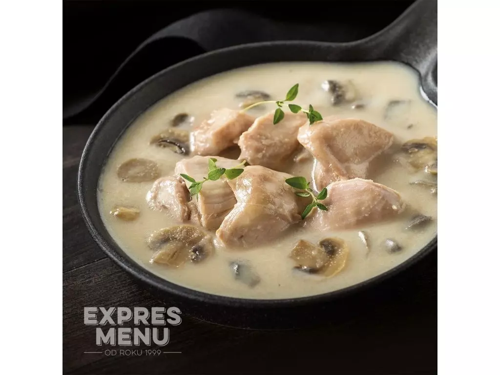 Šťavnaté kousky kuřecího masa v jemné smetanové omáčce s čerstvými žampiony restovanými na másle. Výborně chutná s rýží nebo těstovinami.