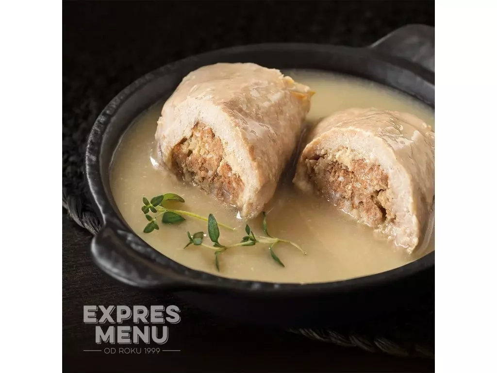 Roláda z vepřového masa, ručně plněná vaječnou fáší s kousky klobásy, v jemné omáčce z restované cibule, hořčice a vajec. Ideální chuťovou kombinaci tvoří s celozrnnou rýží.
