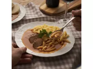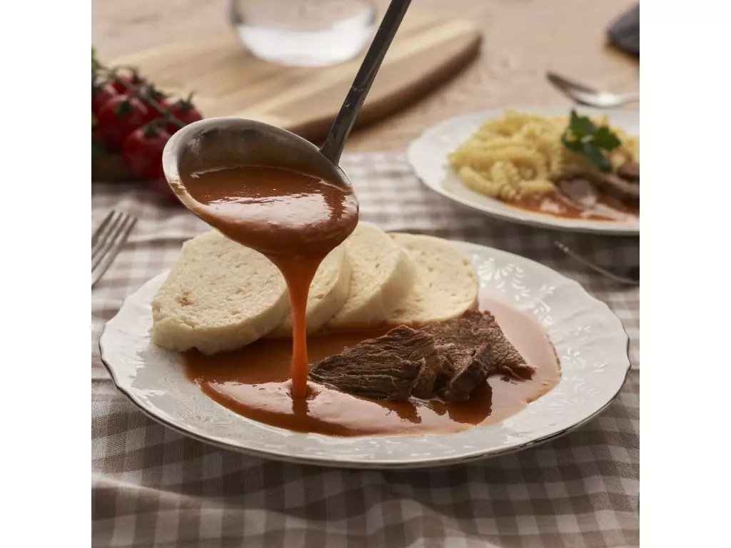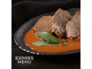 Libové plátky hovězího masa dušené v omáčce z kořenové zeleniny, cibule a rajčatového protlaku. Omáčka je dochucena divokým kořením a skořicí. Další info