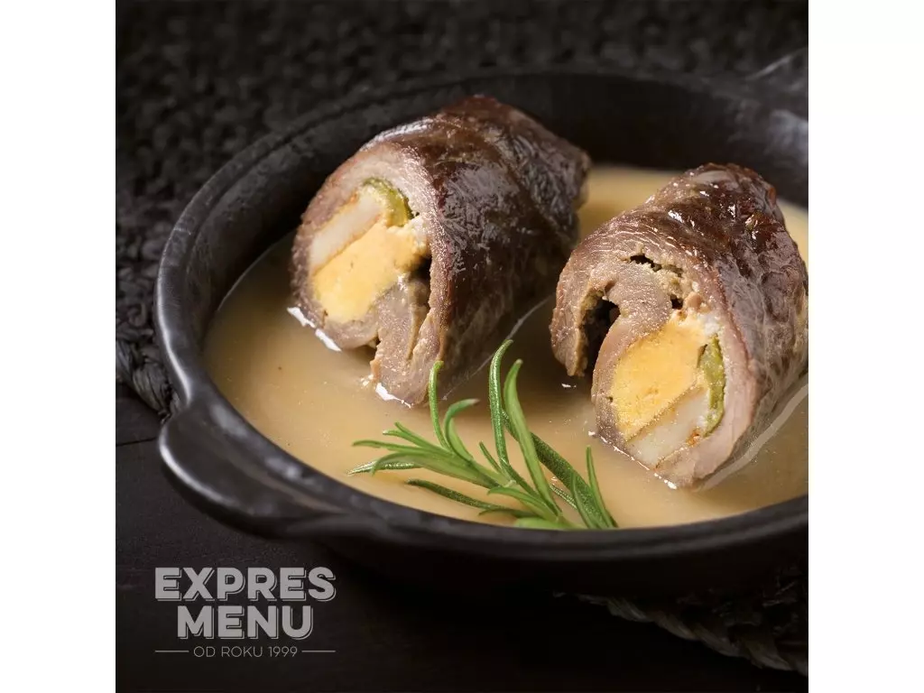 Křehká roláda z hovězího masa ručně plněná okurkou, vajíčkem a uzeným špekem, s jemnou omáčkou z taženého vývaru, cibule a pepře.