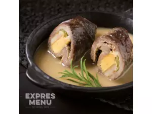 Křehká roláda z hovězího masa ručně plněná okurkou, vajíčkem a uzeným špekem, s jemnou omáčkou z taženého vývaru, cibule a pepře. Další info