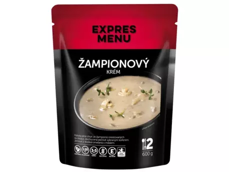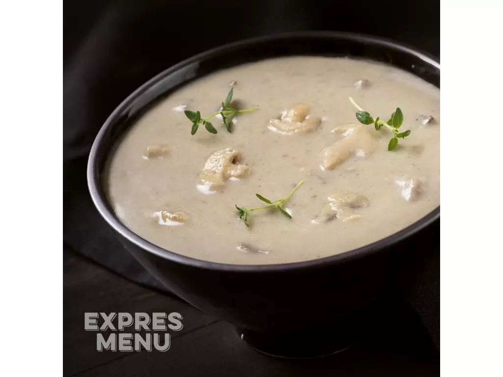 žampiony (21,3 %), mléko, smetana, cibule, rýžová mouka, kukuřičná mouka, řepkový olej, máslo, sůl kamenná, kmín, pepř.